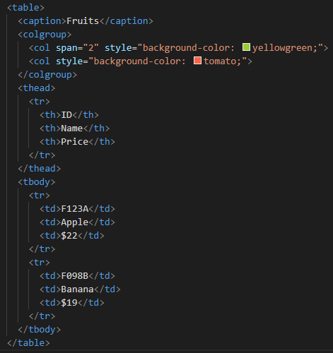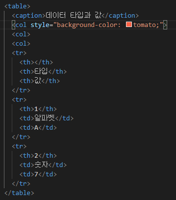 - 연속적으로 <col>에 스타일을 적용시키고자 할 때 span 속성 사용.