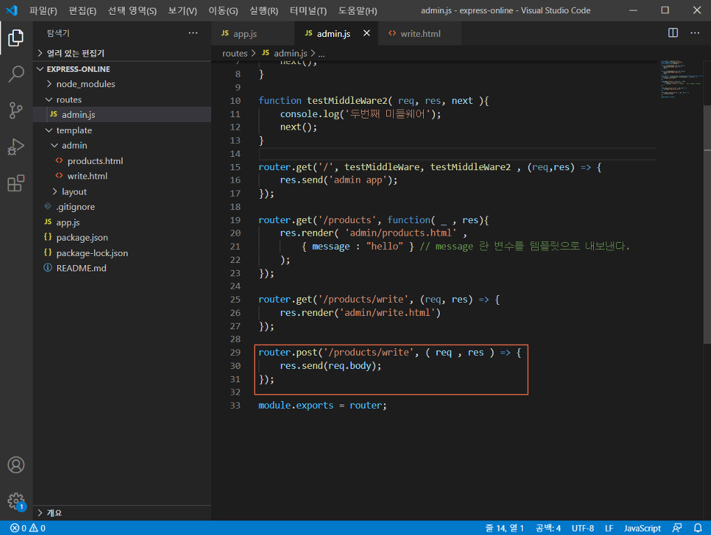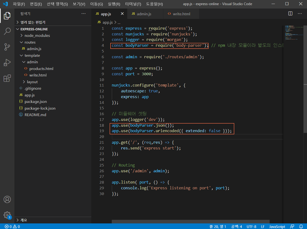 해당 화면이 뜨는 것까지 확인하였으면 app.js로 돌아가 body-parser를 설정한다.