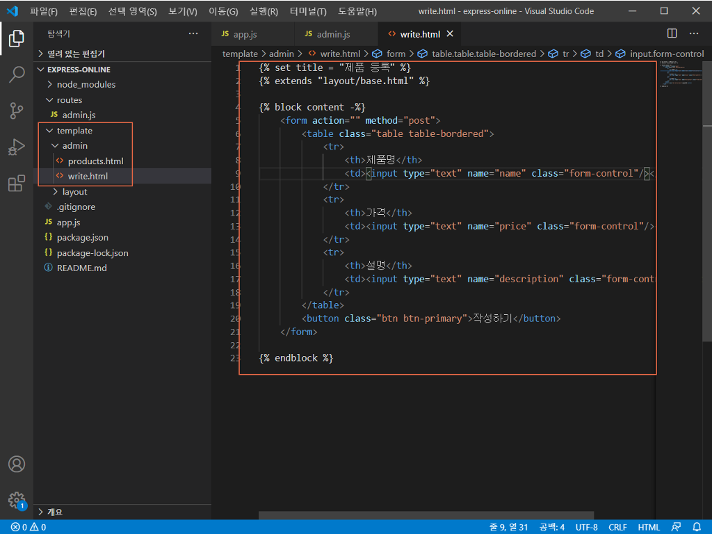 추가하였으면 template/admin 폴더에 write.html 파일을 새로 생성하고 아래의 소스 코드를 넣어준다.