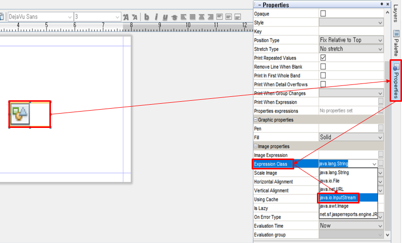 •이미지 클릭 -> Properties 클릭 -> Expession Class를 java.io.inputStream으로 변경