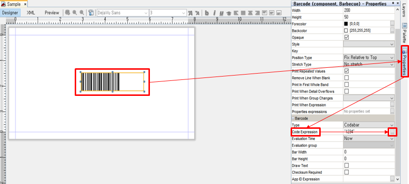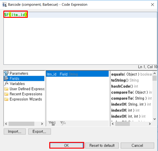 • 바코드 클릭 -> Properties -> Code Expression의 …을 클릭.