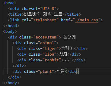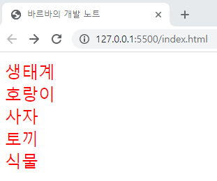 - 실제로 위의 예에서 .ecosystem에 해당하는 생태계 텍스트뿐만 아니라 그 하위의 동물, 식물, 호랑이 등의 요소들까지도 빨간색 텍스트로 변경됨.