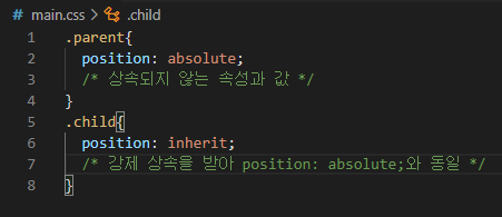 - 위의 예시와 같이 상속되지 않는 속성(값)도 position: inherit;이라는 속성/값을 사용하여 부모에서 자식으로 강제 상속시킬 수 있음.