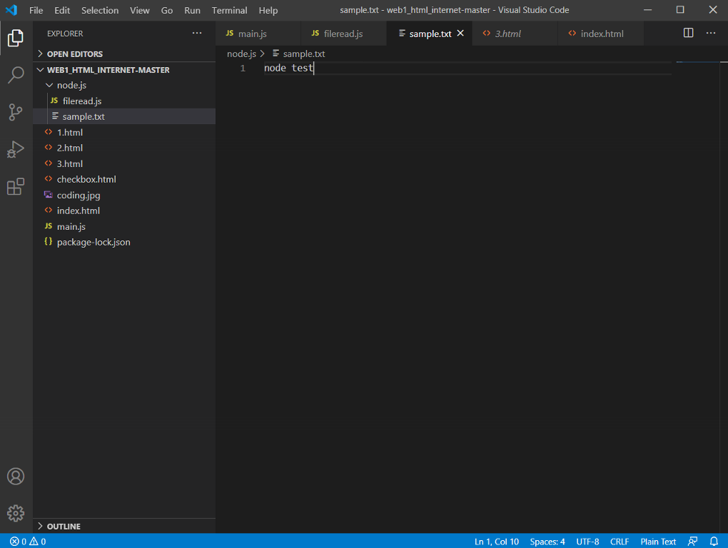 새로운 폴더(node.js)를 만들어 fileread.js와 sample.txt 생성