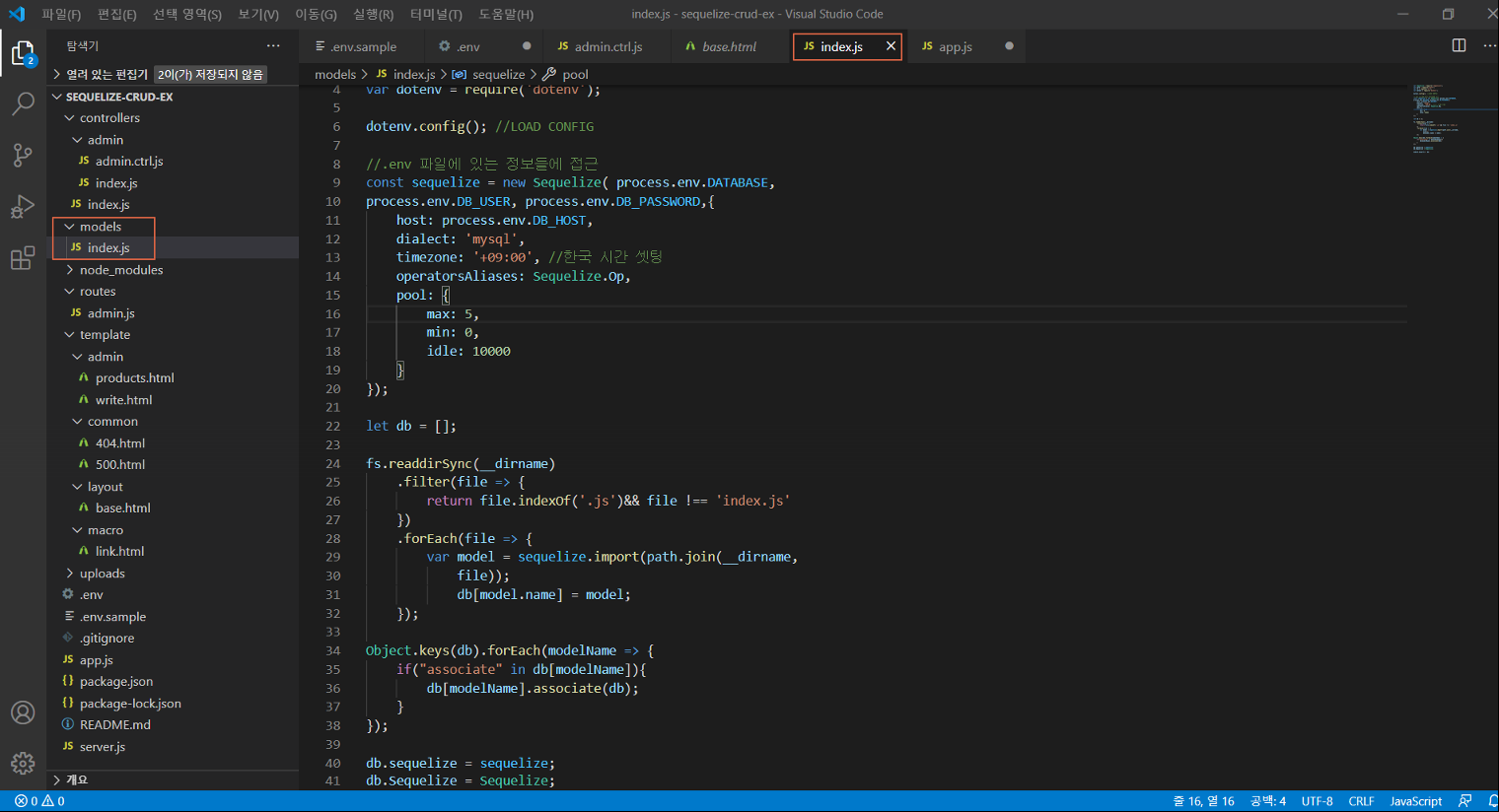 models라는 폴더를 생성하여 그 아래 index.js 파일을 생성한다.