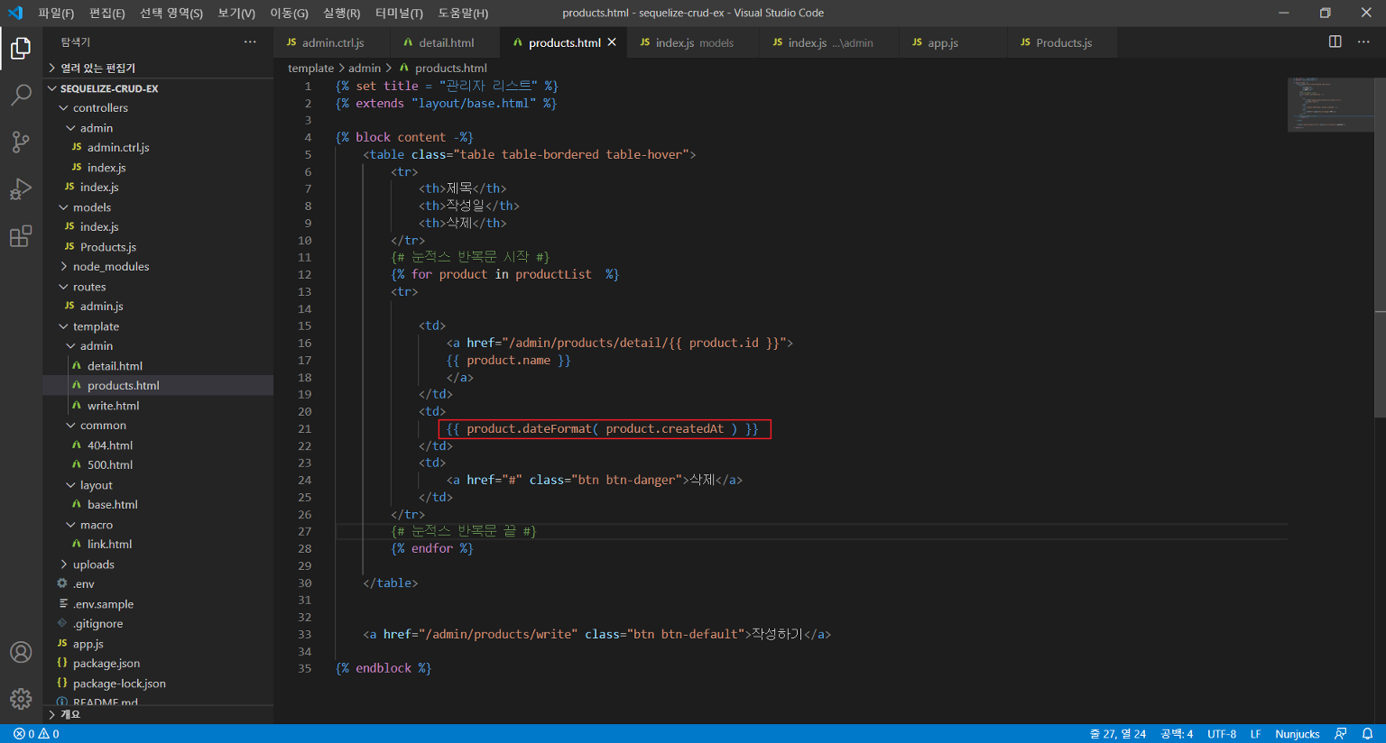 화면에 뿌려주는 html파일(products.html)에서 해당 함수를 불러 사용한다.