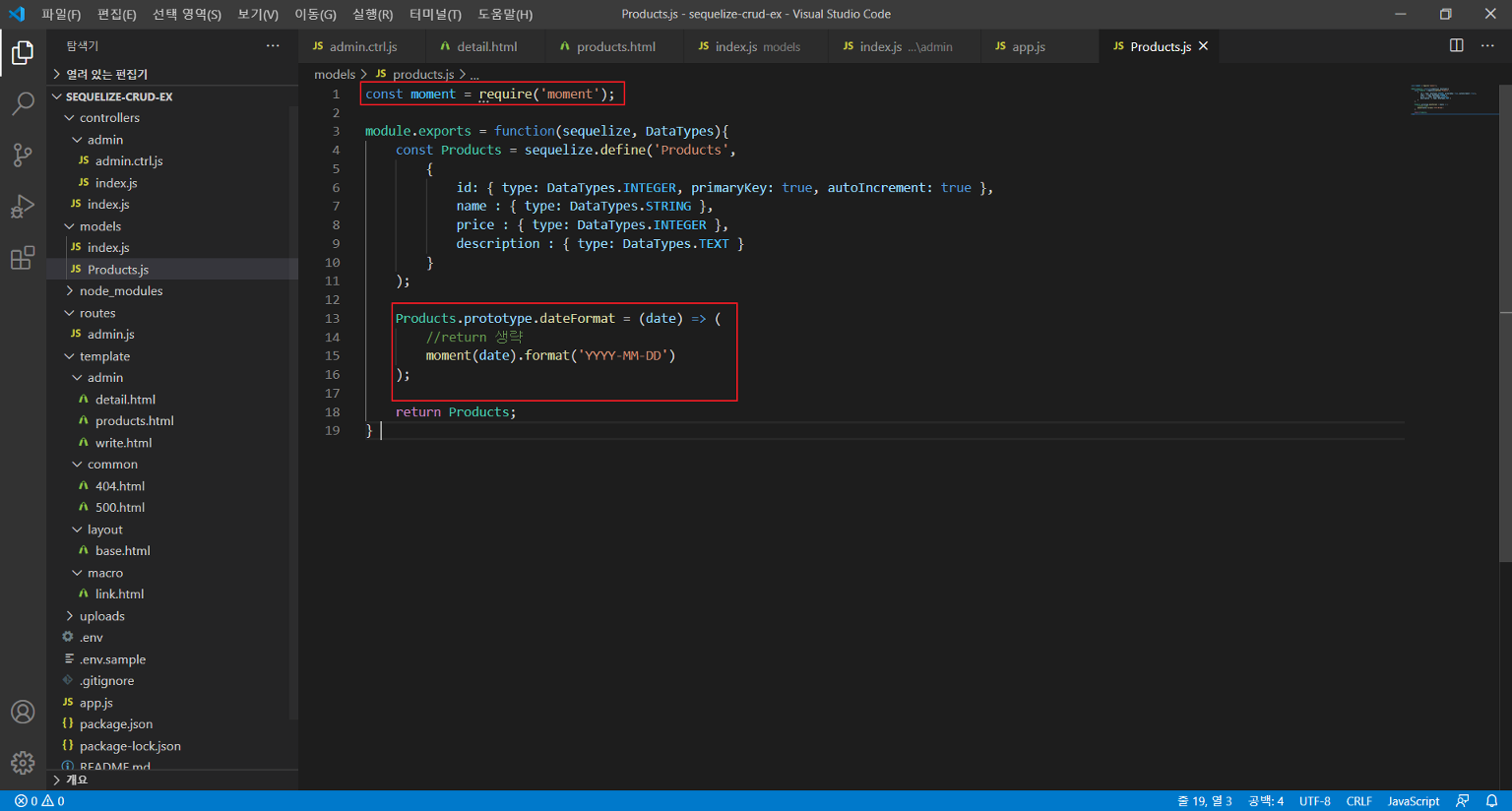 날짜형식을 지정할 js파일(Products.js)에 moment 관련 아래 소스를 추가한다.