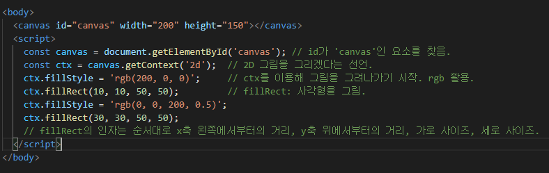 <canvas> 영역에는 Javascript를 통해 그림을 그림. HTML과 CSS로는 그리지 않음.